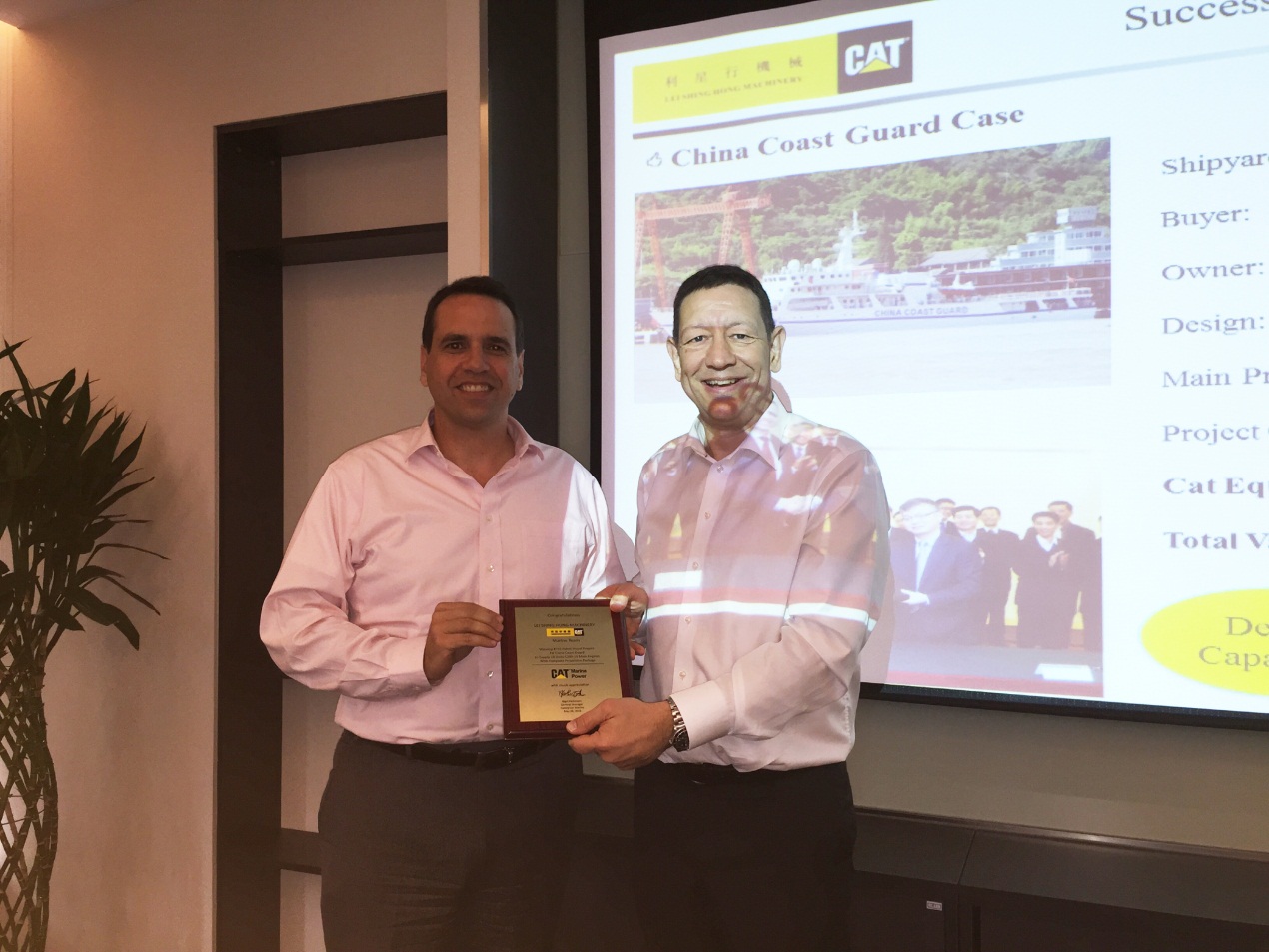 2015年5月26日,卡特彼勒船舶部董事總經理Nigel Parkinson及亞太區銷售經理陳耀明先生帶領其團隊成員到訪利星行機械發動機事業部。為了表彰利星行機械船機組在中國政府船市場中取得如此傲人的佳績,Nigel Parkinson先生向利星行機械船機組銷售總經理洪波先生頒發了榮譽獎牌,并對該項目團隊成員做出的貢獻與努力給予了高度的評價和肯定。