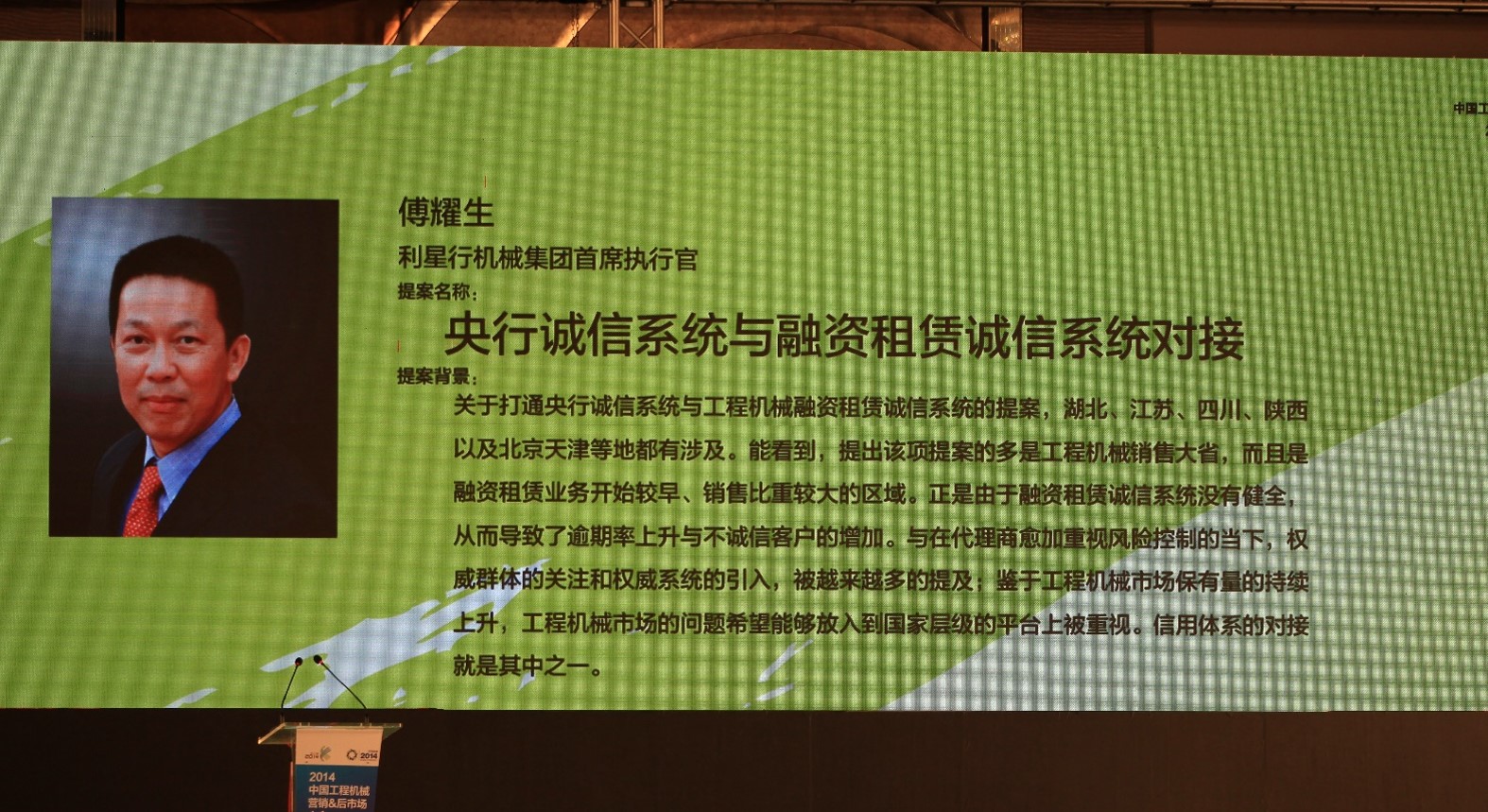 作為工程機(jī)械協(xié)會代理商工作委員會的常務(wù)副理事長,利星行機(jī)械集團(tuán)首席執(zhí)行官傅耀生先生也參加了此次盛會。傅耀生先生一直關(guān)注并積極致力于推動工程機(jī)械行業(yè)的健康發(fā)展,并于2012年出任首輪輪值會長,在此期間他提出了“培育中小代理商的成長發(fā)展”并主導(dǎo)開展了一系列中小代理商的培訓(xùn)和學(xué)習(xí)活動。本次會議中作為巔峰對話的首位發(fā)言嘉賓,他就如何推動“央行誠信系統(tǒng)和融資租賃公司誠信系統(tǒng)對接”發(fā)表了獨(dú)特見解,引起與會者的強(qiáng)烈共鳴,獲得了專家評審團(tuán)的全票支持。此議題也被評為最受關(guān)注的三個議題之首,將被列為下一年度行業(yè)領(lǐng)導(dǎo)與相關(guān)政府部門溝通推進(jìn)的工作重點。